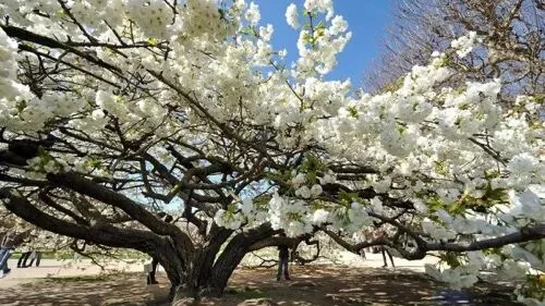 这里最出名的是两棵巨大的樱花树,一粉一白,盛开时非常惊艳,每年都有许多人在树下拍照。