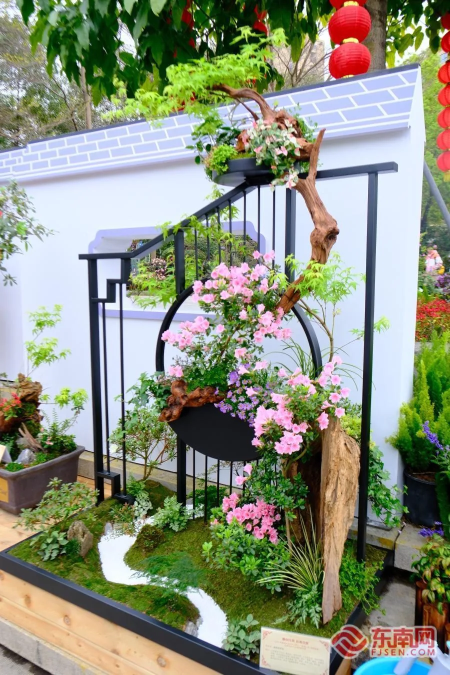 “审美没有绝对标准,有人欣赏架构,有人欣赏花朵,初学者可以先模仿网上的成熟作品,做得多了自然会形成自己的理解。”在福州市晋安河公园管理处的作品《映山红韵·峰起榕城》上,创作者们以枯木模拟山的轮廓,用红色的杜鹃花点缀其间,布置成山水造型,契合“红韵”的主题。