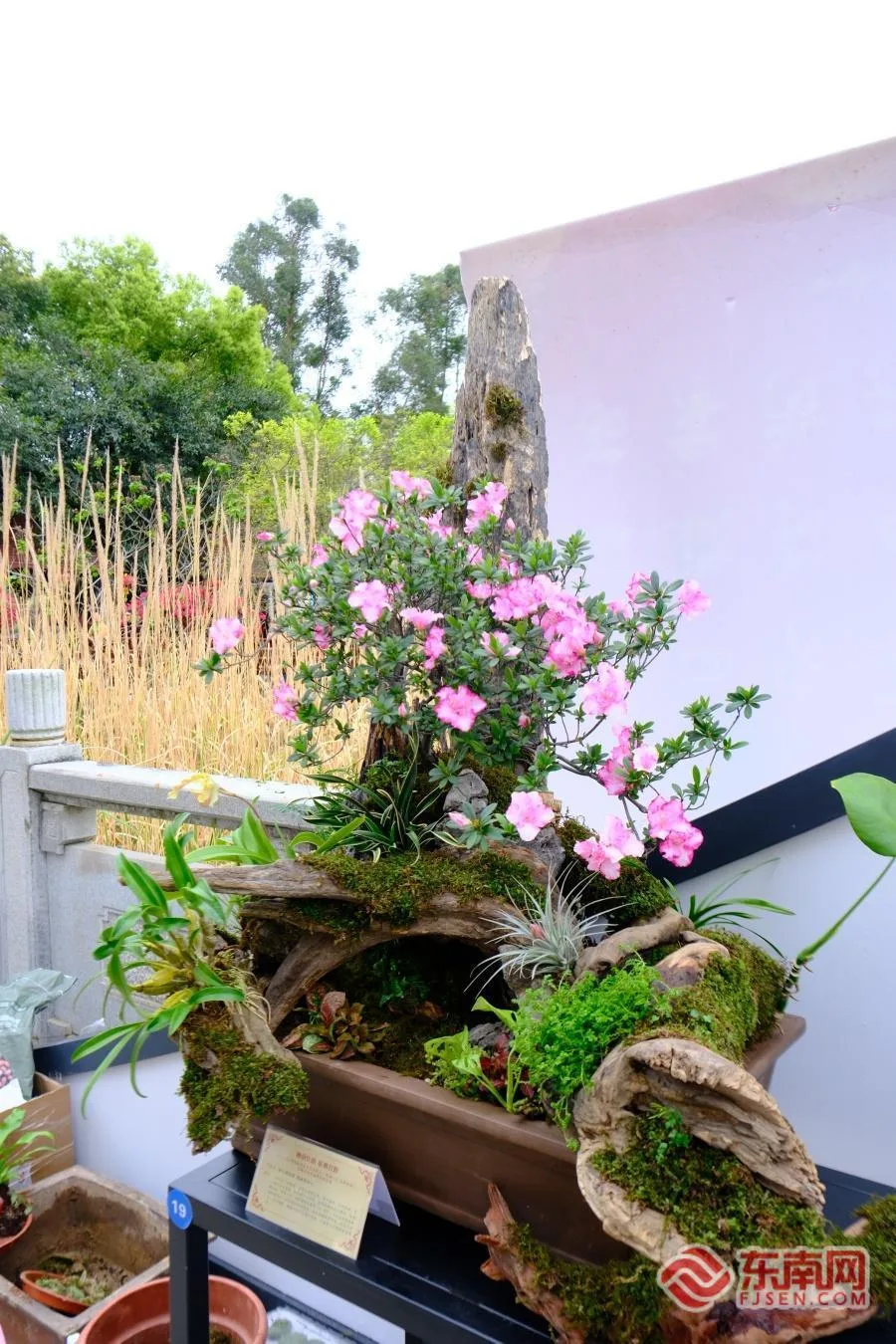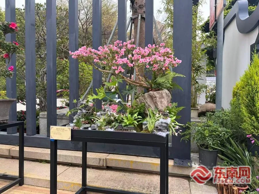 福州市园林绿化工程质量监督站的展位前,以沉木打造的山峰造型盆栽格外醒目。创作者钟琳、卢思兰希望用这种方式体现杜鹃花坚韧磅礴的气质。