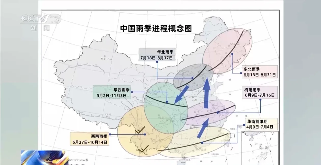 5月中下旬南海季风爆发以后,华南地区降水会明显增加,形成华南前汛期;此后,东亚夏季风开始进入全盛时期,季风雨带加强并向北移动;