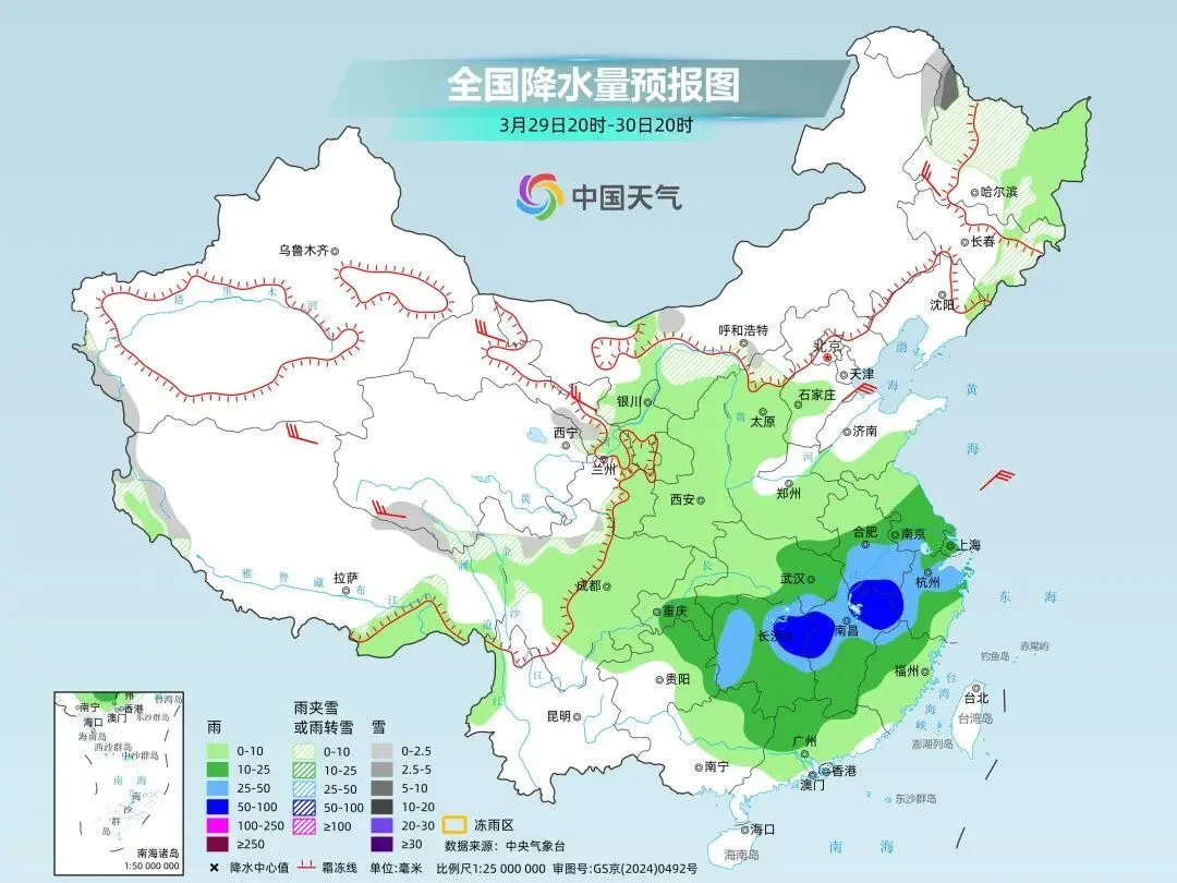 25日夜间,贵州中南部、湖南中部、江西中部有中到大雨,局地将有暴雨,或伴有短时强降雨等强对流天气;26日白天,随着急流东移,江西中部、福建北部将有中到大雨,局地暴雨。