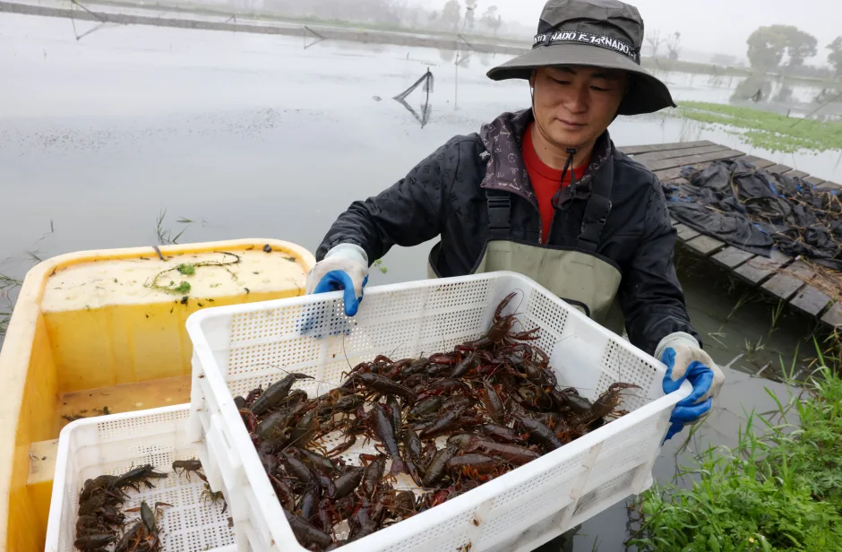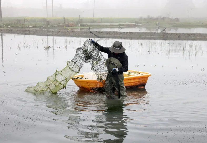 温州网讯 3月25日上午,温州市瓯海区仙岩街道岩二村稻虾共作基地里,当地的养殖户正在水田里忙碌着,将钻进捕虾笼里的小龙虾捞上水面。