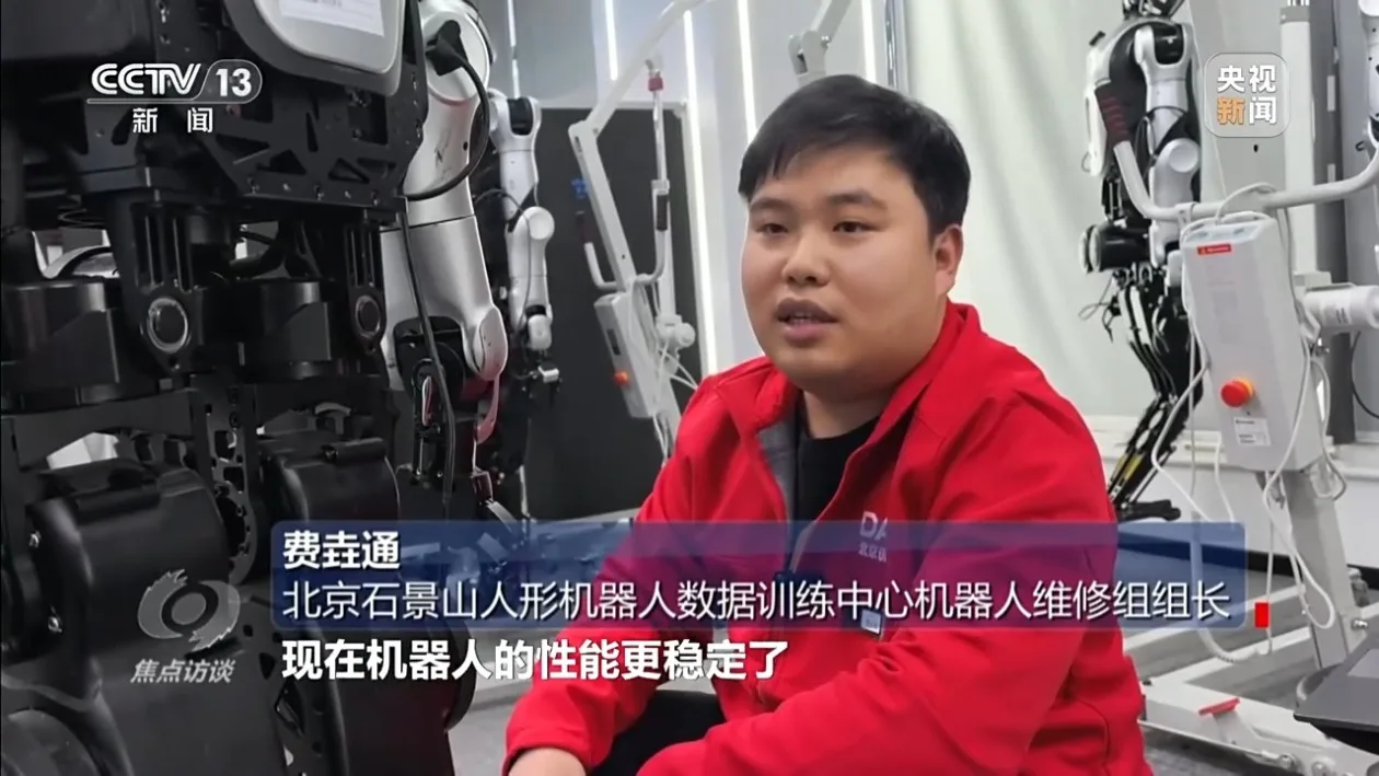 北京石景山人形机器人数据训练中心机器人维修组组长 费垚通:半年前,机器人需要维修的频率比现在高,现在机器人的性能更稳定了。但是,真正走入实际工作场景,还需要很多训练任务。不过看到它现在的进步效率,我坚信它能够在不久的未来,在更艰苦、更危险的环境替我们分担工作,我相信这一天一定会到来。
