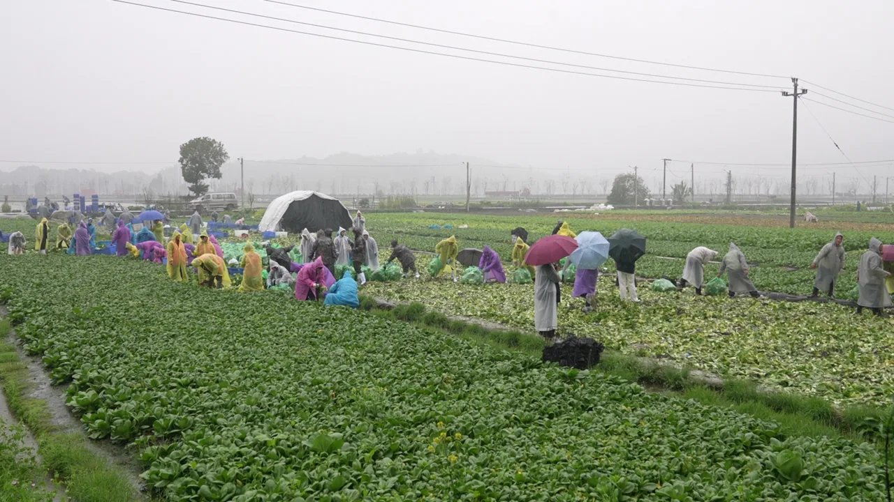 3月26日上午,大雨如注,瑞安桐浦镇岭南村的田间地头,却是一片热火朝天——上百名志愿者身披雨衣,脚踩泥泞,俯身弯腰,用双手为一位素不相识的菜农撑起了雨中的希望。