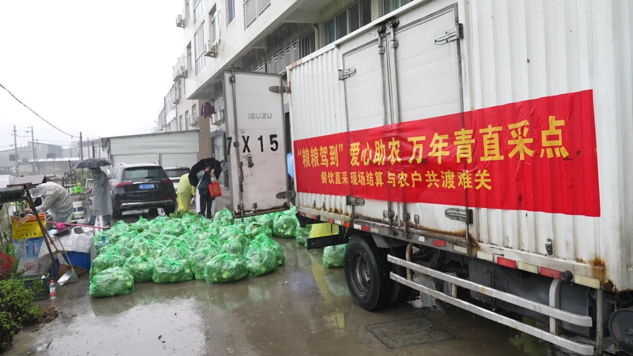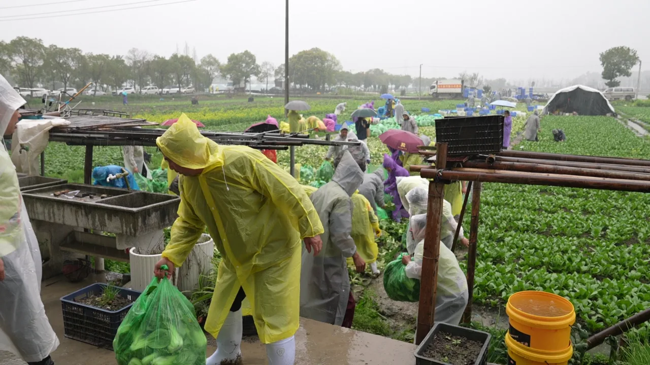 温州永丰超市生鲜采购部总监助理唐宗勤,早上6点多就带着20多名员工赶到地里。“昨天看到新闻后,我们第一时间取样检测,青菜各项指标均合格。”他们自备货车、菜筐,抵达后立刻投入采收。“大雨天,几名员工滑倒摔了,但大家依旧坚守岗位。”唐宗勤说,只要条件允许,超市愿意把剩下的青菜全部收购。