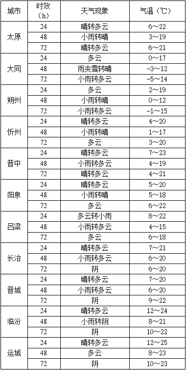 全省晴天转多云,忻州西部、吕梁等地的部分以及朔州、临汾等地的局部地区有小雨,山区有雨夹雪。最高气温:全省16~25℃;最低气温:高寒地区-3℃左右,北部及中南部山区-2~5℃,中南部其余地区5~12℃。