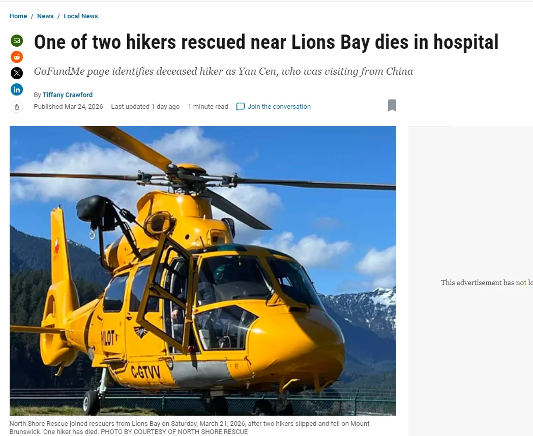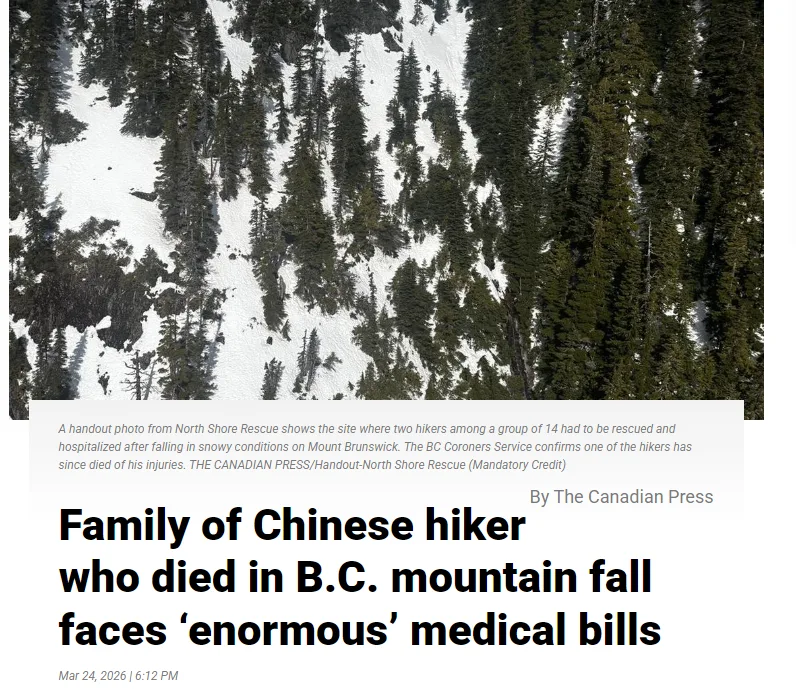 在温哥华北岸 Mount Brunswick 一带的一次登山活动中,来自中国的华人 Yan Cen(朋友称他“石头”)在队友发生滑落危险后选择下去施救,在过程中不慎失足坠落。尽管随后有救援力量介入,他最终仍不幸身亡。