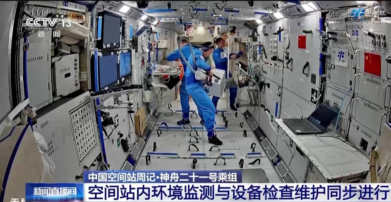 空间站内环境监测与设备检查维护同步进行。三名航天员使用相关仪器设备完成舱内空气洁净度测试、声环境监测。对饮水分配器、再生生保系统设备进行检查维护,并定期整理舱内物资、转移存放废弃物,保持站内的环境整洁。