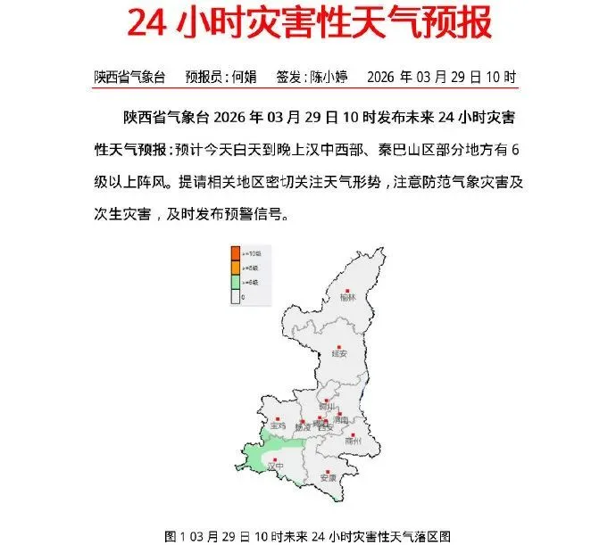 预计今天白天到晚上汉中西部、秦巴山区部分地方有6级以上阵风。提请相关地区密切关注天气形势,注意防范气象灾害及次生灾害,及时发布预警信号。