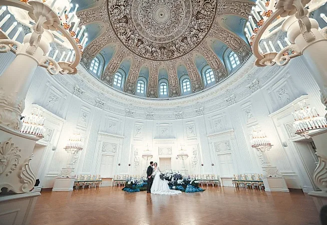 建筑中心的穹顶呼应了君士坦丁堡圣索菲亚大教堂,侧翼能让人联想到中世纪城堡,精美的白石门窗贴脸和尖拱则赋予整个建筑群童话般的阁楼外观。整体布局具有古典主义的严谨:主楼3层,两侧连接一层厢房,共同围合出一个朝向彼得堡大道的迎宾院落。