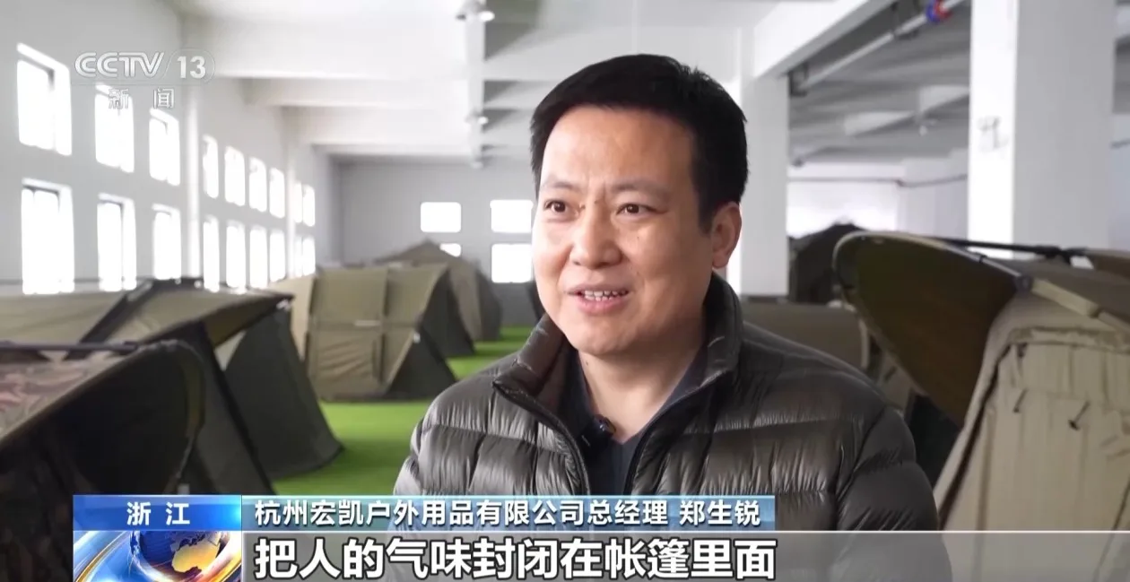 杭州宏凯户外用品有限公司总经理 郑生锐:隐形网纱是单向透视的,涂层贴胶,把人的气味封闭在帐篷里面,对动物进行隔离,想把这个春秋两季的户外延伸到冬夏,订单比去年增加20%左右。
