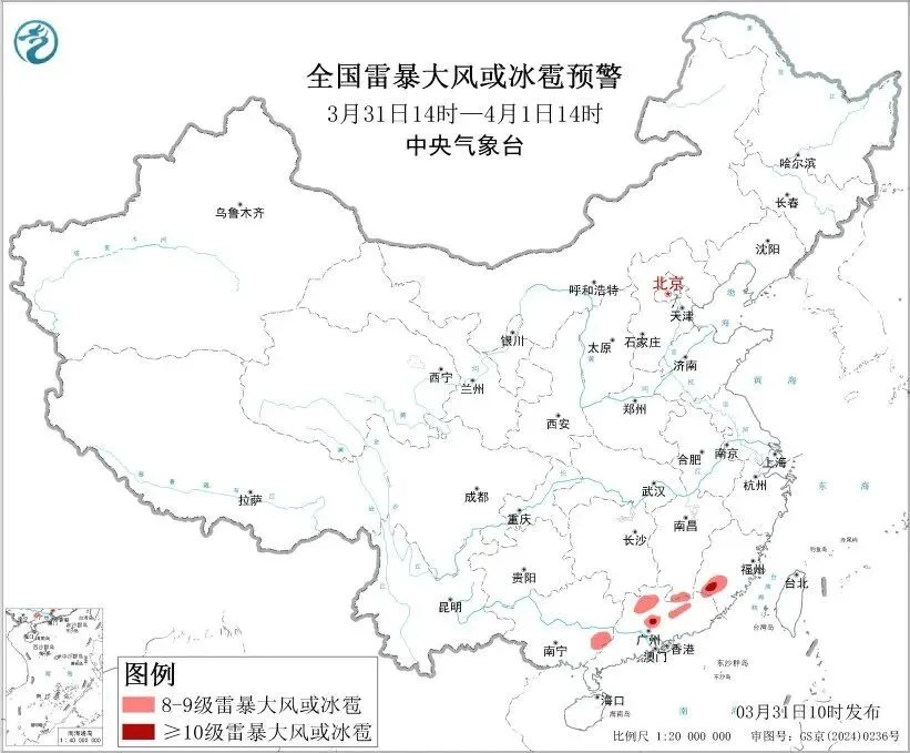 预计3月31日14时至4月1日14时,华南地区中北部、江南南部等地的部分地区将有8级以上雷暴大风或冰雹天气,其中,福建西南部、广东中部等地的部分地区将有10级以上雷暴大风,最大风力可达11级以上;华南中北部、江南东部和南部等地的部分地区将有小时雨量大于20毫米的短时强降水天气,其中,江西南部、福建西南部、广东中北部等地的部分地区小时雨量大于50毫米,最大可达60毫米以上。