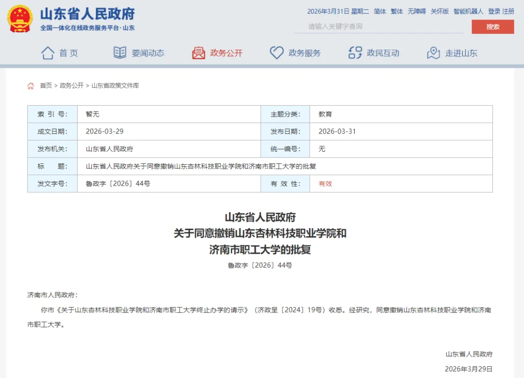 你市《关于山东杏林科技职业学院和济南市职工大学终止办学的请示》(济政呈〔2024〕19号)收悉。经研究,同意撤销山东杏林科技职业学院和济南市职工大学。