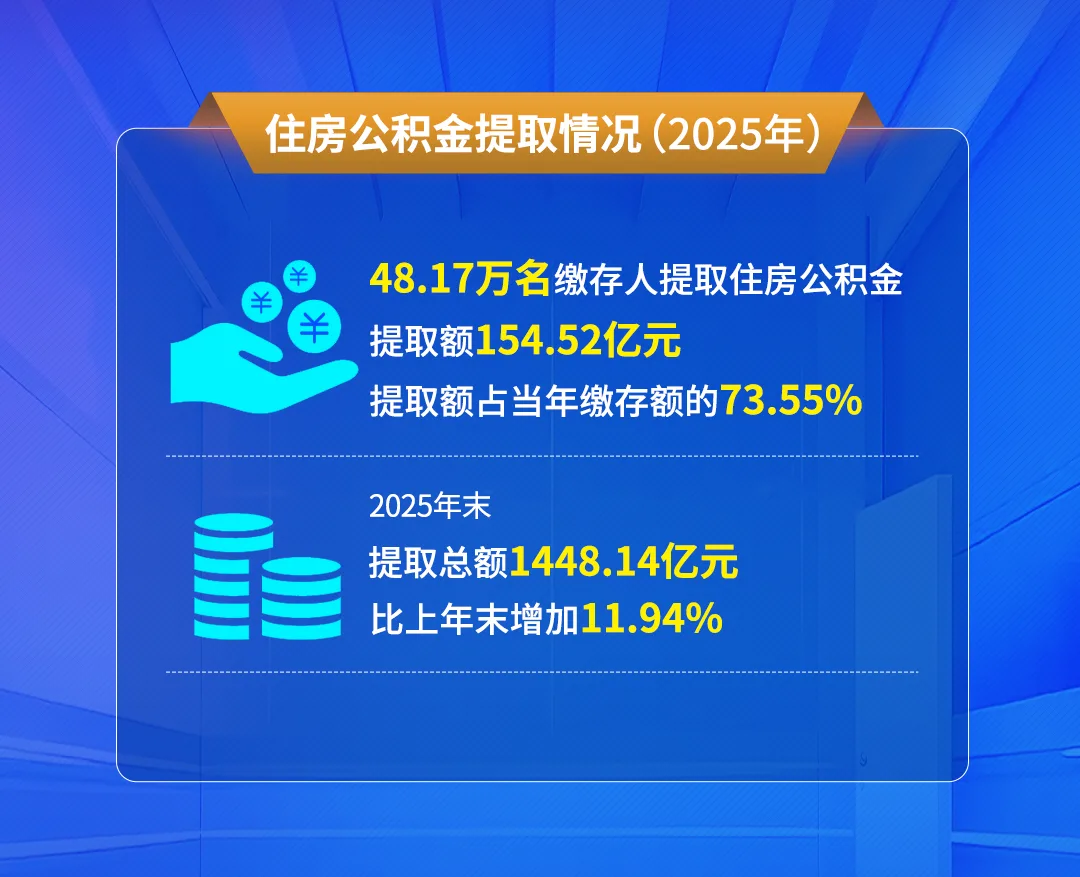 2025年,全市48.17万名缴存人提取公积金154.52亿元,提取额占当年缴存额的73.55%。