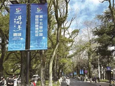连日来,市区人民路、九山路等主要道路悬挂起崭新的“第十五届中国国际园林博览会”宣传旗标,与绿树成荫的“绿色长廊”构成了美丽的画卷。蒋文广 摄