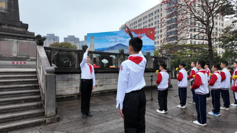 “站岗”少先队员整齐列队走向烈士纪念碑,完成庄严的上岗仪式。莆田市委文明办供图