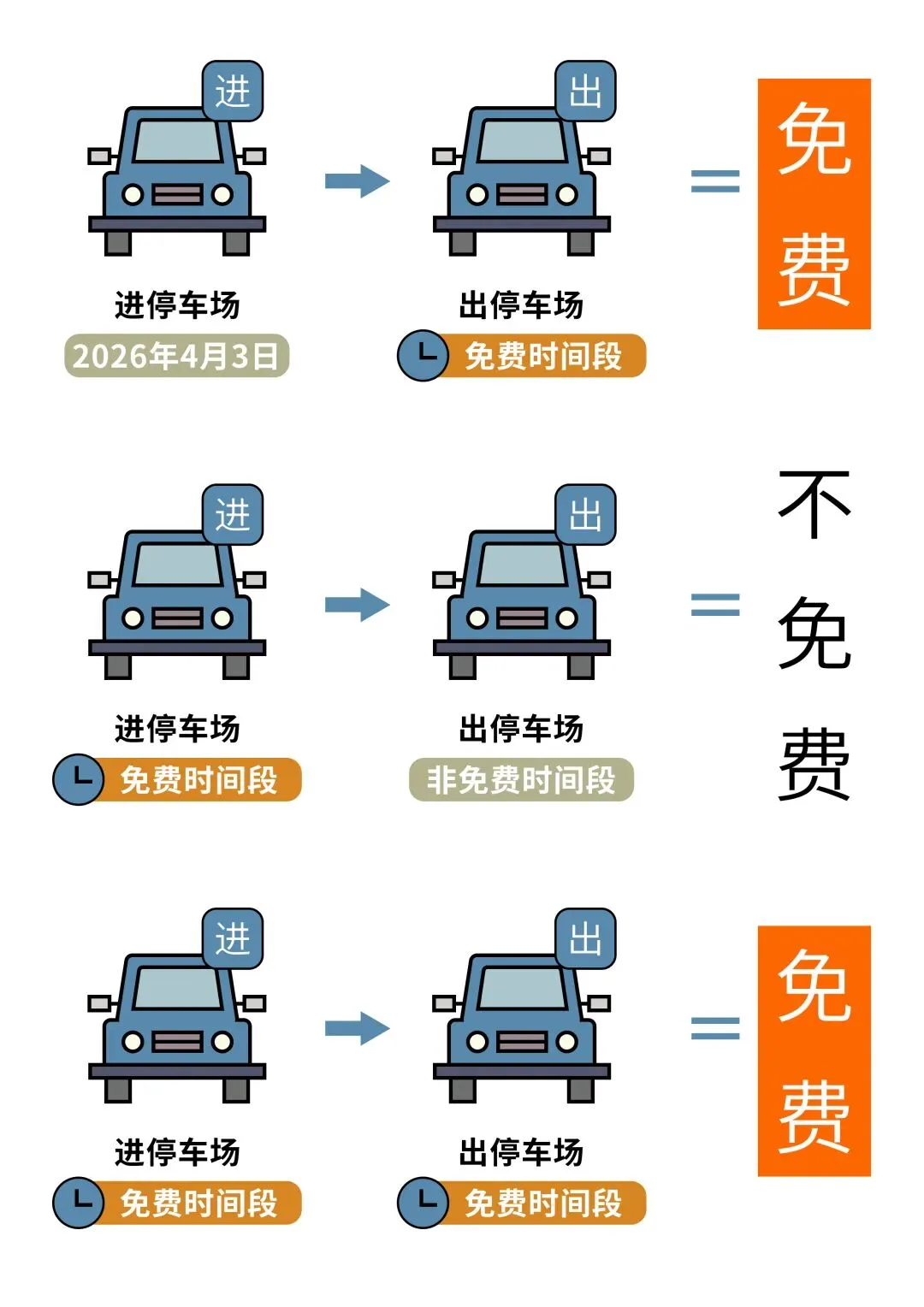 ·小贴士:免费时段内进场并离场的车辆,享受全额免费;若车辆在免费时段结束后仍未驶离,则从免费时段结束时起按正常标准计费,请大家合理安排时间。注意:为确保车辆通畅,网约车停车场和出租车停车场不在此次活动范围内,仍是按照原标准执行。