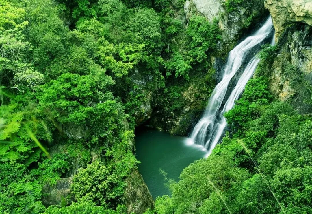 坐于梅雨亭,仰观飞瀑奔涌,俯看潭水澄碧如玉;山间林木葱茏,水气沁凉,闭上眼,满是自然的宁静与惬意。