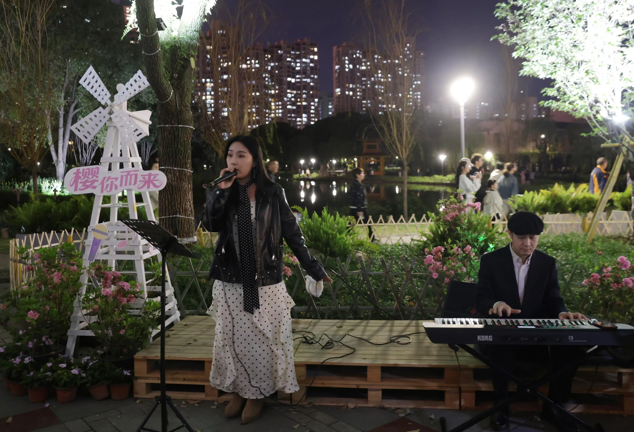 “樱你而来 全城园博”夜樱市集当晚启幕,去年马鞍池的夜樱花容盛景曾艳冠全城,火上央视而名闻全网。今年,为丰富赏花游玩内容,鹿城文旅部门还设立了夜樱主题市集,有蓝调小乐队演绎,樱花树下品咖啡等内容,点亮夜樱赏花文旅季,夜樱市集将持续至4月12日。