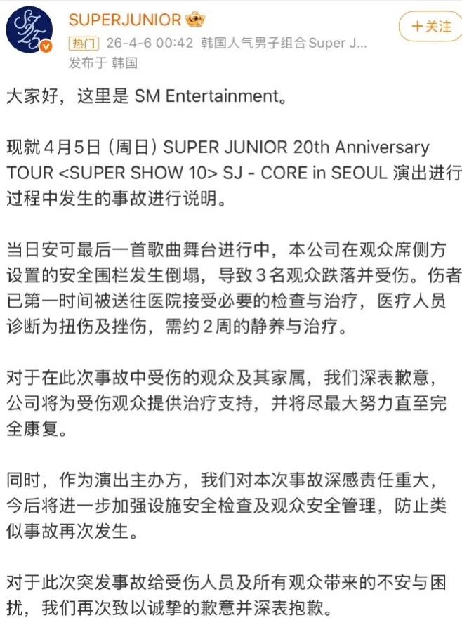 今天凌晨,@SUPERJUNIOR 官方微博发文道歉:
