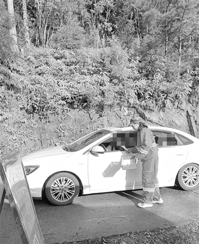 早上天开始放晴,郑邓火简单收拾好家里卫生后就守在闸道口。一辆辆车开过来,她总是笑脸相迎,但口气却不容商量:“花可以拿去,打火机、香纸、蜡烛一律不能带入,这是规定。”仔细检查完毕后,她才会抬杆放行。“这里平时就查得严,去年连续半个月不下雨时,24小时不能走开。现在清明也是一样,一点火星都不能带进去。”在郑邓火值守闸口的同时,丈夫林继森则独自沿着防火隔离带进山巡查。