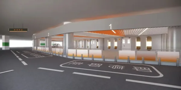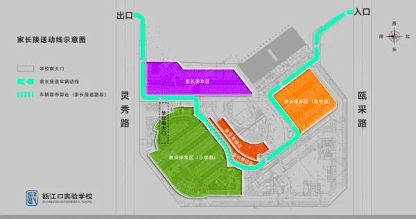 方案的核心,是将学校地下停车场改造为标准化“接送岛”,并确立了“即停即走、单行循环”的逻辑:接送车辆从北门驶入,沿导视流线至接送岛,完成接送后即刻从南门驶出。这一闭环模式,彻底切断了校门口路面的车流交织。