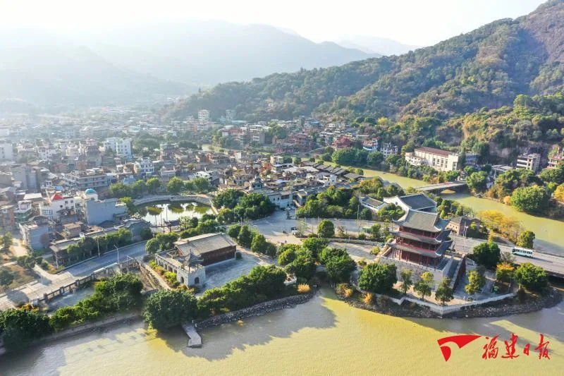俯瞰闽安古镇,三面环山、一面临水,邢港河一路曲折蜿蜒,横穿古镇,汇入闽江。