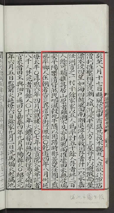弘治《温州府志》对这次台风有着极为详细的记录:“飓风挟雨,申酉益甚,拔木飘瓦,人立欲仆,市店、僧刹摧压相望。夜潮入城,沉浸半壁,人方上屋、升木以避,俄而屋漂木没,四望如海。四鼓风回南、潮退,浮尸蔽川,存者什一。”以永嘉任洲村为例,“一村千余家,家以五人为率,计五千余人,存者才二百人”。而那些居住在山原之上、潮水淹不到的人家,“虽潮不及,亦为风雨摧坏,田禾无收”。灾难过后,百姓无粮可食,“民啖湿谷死”。