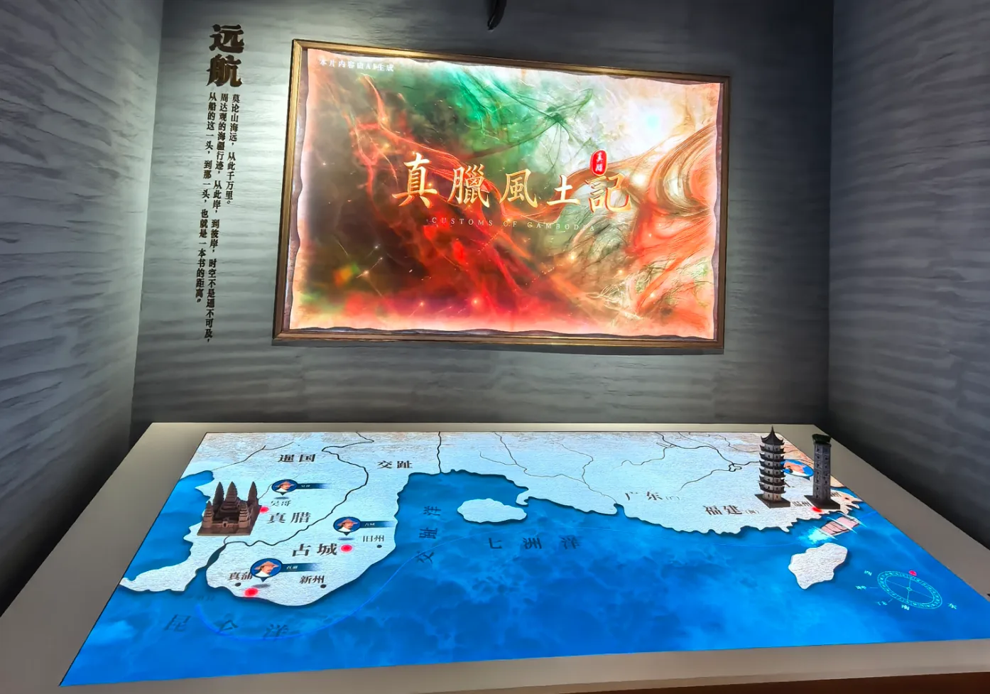 周达观展览馆则带领观众开启一场跨越山海的海上丝路之旅。元代温州人周达观从朔门古港出发,远赴真腊(今柬埔寨),写下不朽文献《真腊风土记》。展馆以“航海日记”为主题,复原船舱、储水陶瓮、航海罗盘等场景,搭配声光电与互动装置,让观众沉浸式重走海上航路。策展人、朔门古港建设管理中心文旅产业科科长林婷婷表示,为确保展陈细节严谨可信,展馆内容全程依托夏鼐等学界泰斗的权威研究成果,并经本地文史专家反复研讨考证,既保证了沉浸式参观体验,又具备坚实的学术支撑。