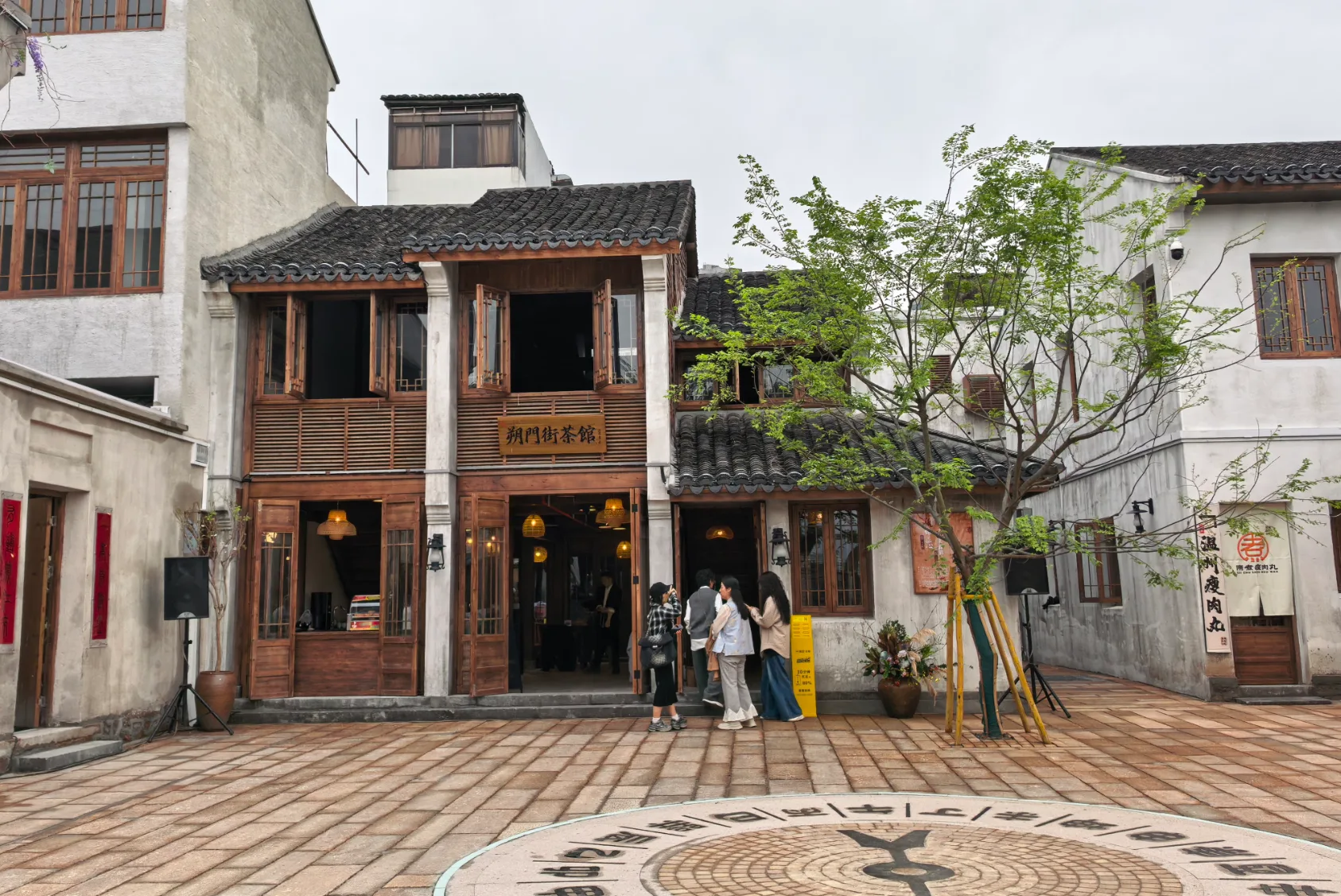 走出展馆,便是古韵悠悠的朔门历史街区。作为温州古城唯一“倚山面江”的街区,这里保留着“山、城、港、江、屿”共生的“斗城”格局。焕新后的街区业态丰富,文创商铺、特色小吃、手作工坊、休闲茶铺错落有致,地道温州烟火扑面而来。瓷片打卡墙、指南针地雕等景观细节,处处彰显海丝文化印记,吸引市民打卡留念。