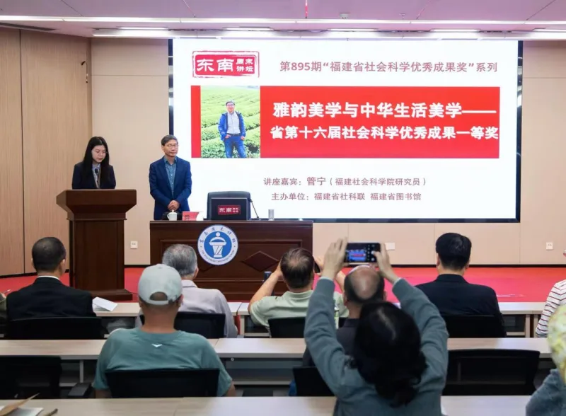 东南网4月13日讯(本网记者 郑琦)4月11日上午,由福建省社科联和福建省图书馆主办的东南周末讲坛第895期在福建省图书馆精彩开讲。福建省第十六届社会科学优秀成果奖一等奖获得者、福建社会科学院研究员管宁以“雅韵美学与中华生活美学”为题,带领读者一同溯源中华美学源流,深入书画、园林、建筑、家具等领域,解码文人雅韵的精髓,并探寻传统美学如何在现代设计与生活中焕发新生。讲座现场吸引了近百位读者到场聆听。