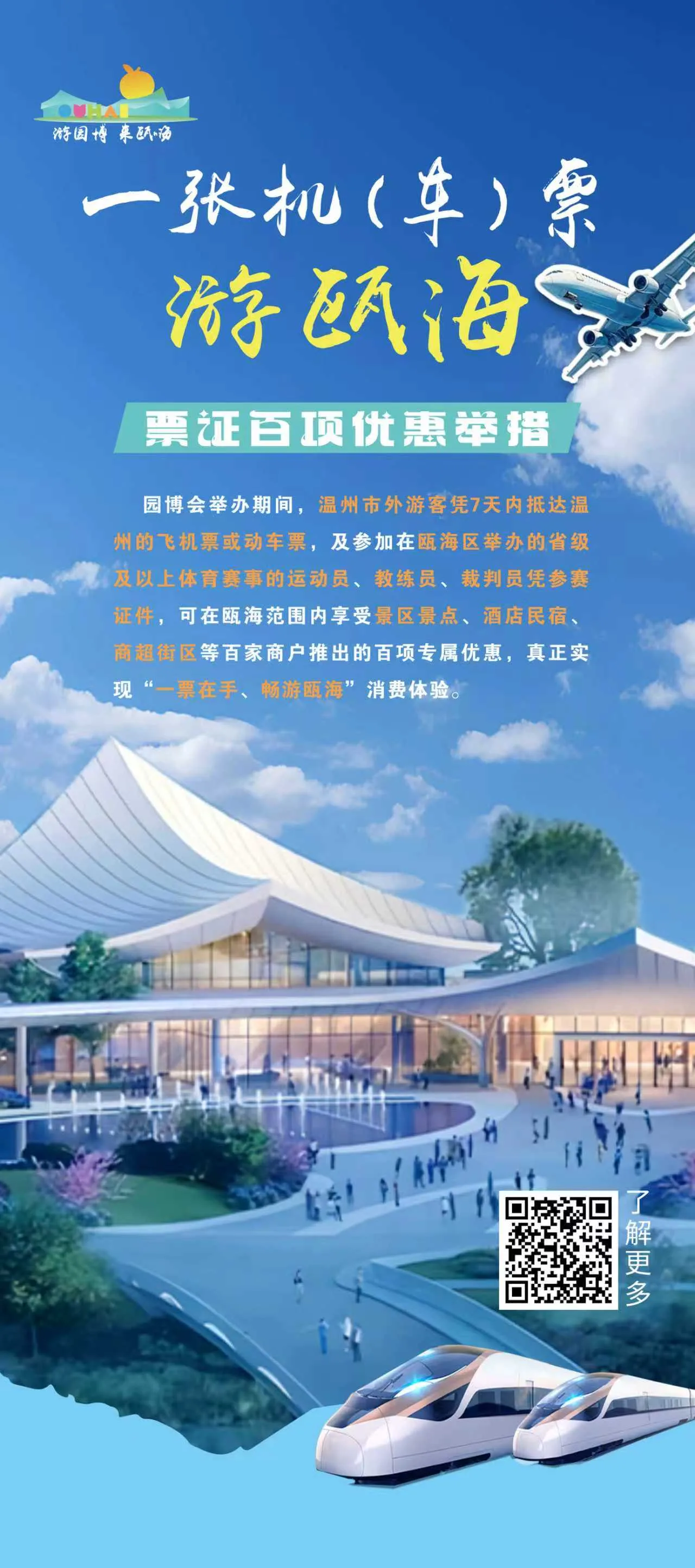 百项优惠,一张票根“通吃”。 4月10日至7月31日(法定节假日除外),市外游客凭7日内抵达温州的飞机票或动车票,以及参加省级及以上体育赛事的运动员、教练员、裁判员等凭相关证件,即可在瓯海百家商户享受专属优惠,覆盖“吃住游购”全链条。