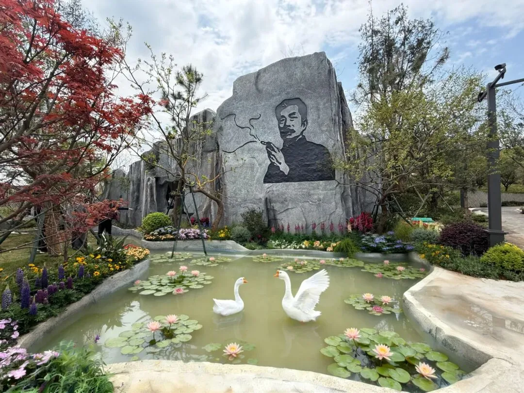入口处,鲁迅先生的岩画默然伫立。那位以笔为刀的绍兴人,一生写尽了故乡的闰土、社戏、茴香豆和乌篷船。此刻他只是静静望着这一方小园——不说一句话,却已道尽一切。