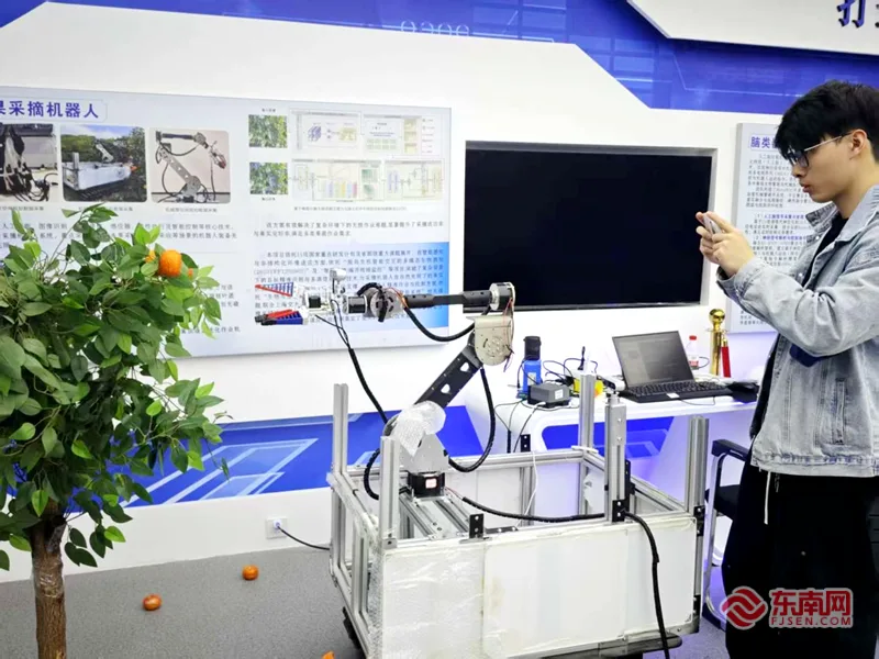 在福建农林大学农林人工智能研究院实验室里,学生们正有序开展具身智能机器人调试与性能测试,水果采摘机器人等装备旁,技术人员同步进行场景化优化作业。