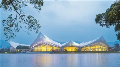 中国馆是园区规模最大的标志性建筑,总建筑面积2.5万平方米。取意“如山似浪、层檐帆影”,将雁荡山的起伏与瓯江千帆之景融为一体,诠释了温州“宋韵瓯风、千年商港”的城市底蕴。建筑依山傍湖,屋顶线条起伏错落,宛若山峦叠翠。驻足远观,能在建筑起伏的轮廓中感受到“山水相依”的意境。场馆保留了两株百年古榕树,今年这两株无柄小叶榕都是108岁,枝干相守,天然“连理”,场馆设计就以它们为核心铺展建筑空间。设计将园区场地中最宝贵的资源——山水“请”了进来。在中国馆核心观景位“榕荫庭”的观景玻璃前,可以尽赏园区山水的变化。为呈现最佳观景效果,最终选用超透、超高、超宽的特殊结构玻璃。其中,单块玻璃最大高度6.5米,相当于两层楼高。