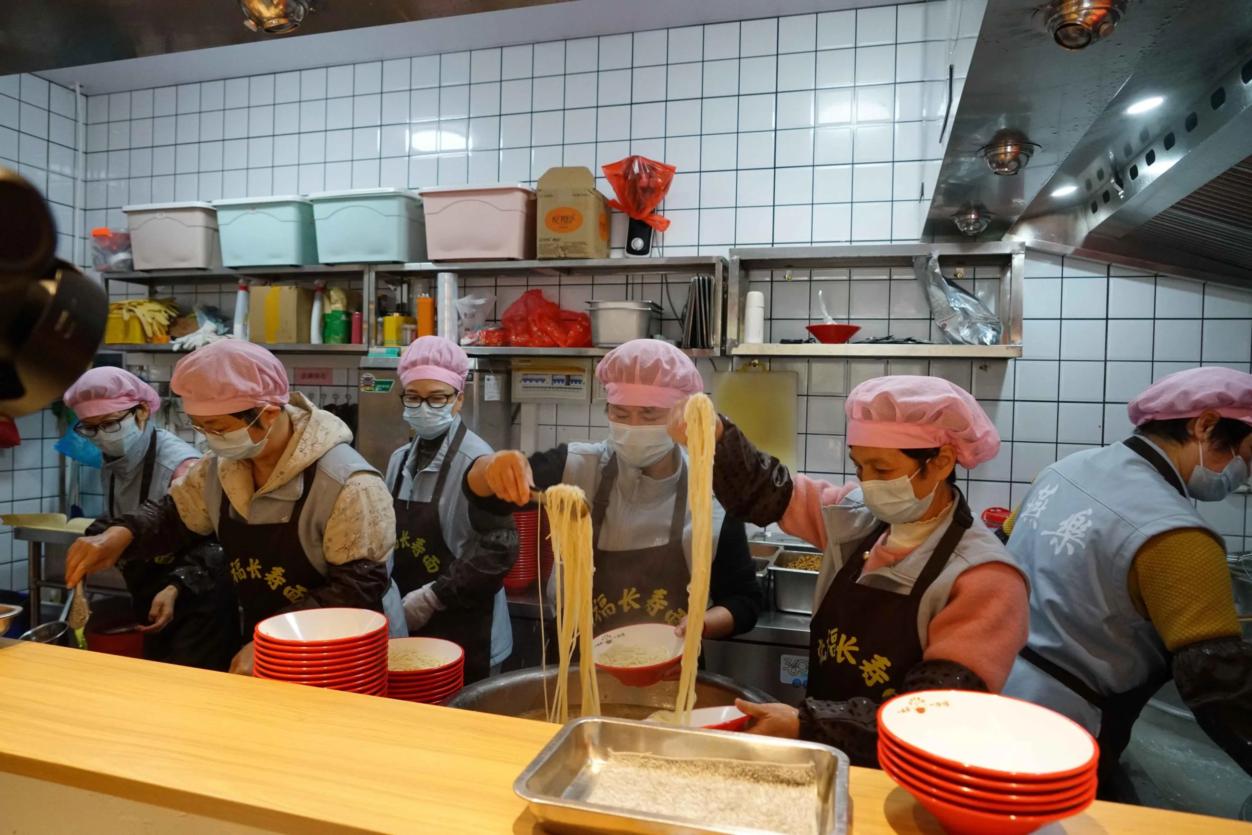 后厨分工有序,正在分装面条。