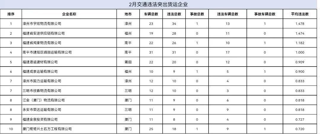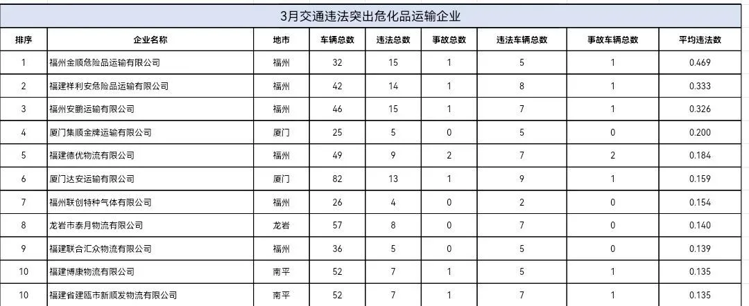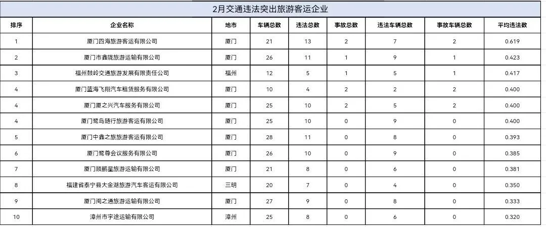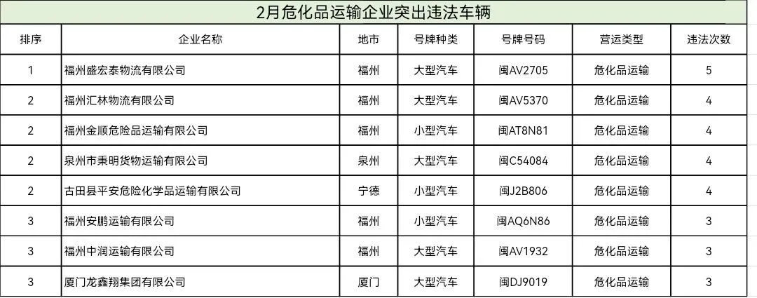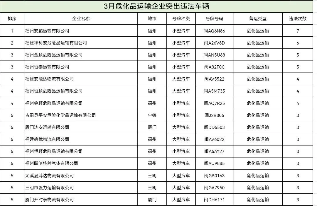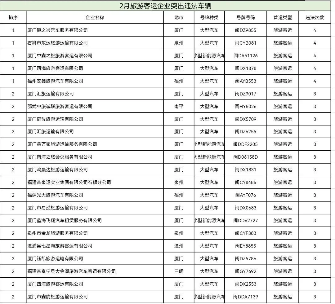 东南网4月20日讯(本网记者 翁莉)日前,福建省公安厅交通管理总队集中曝光2026年2—3月全省公路客运、普通货运、旅游客运、危险货物运输四类重点行业中,交通违法总量居前的运输企业及车辆名单,通过公开警示压实企业主体责任、强化源头风险治理。
