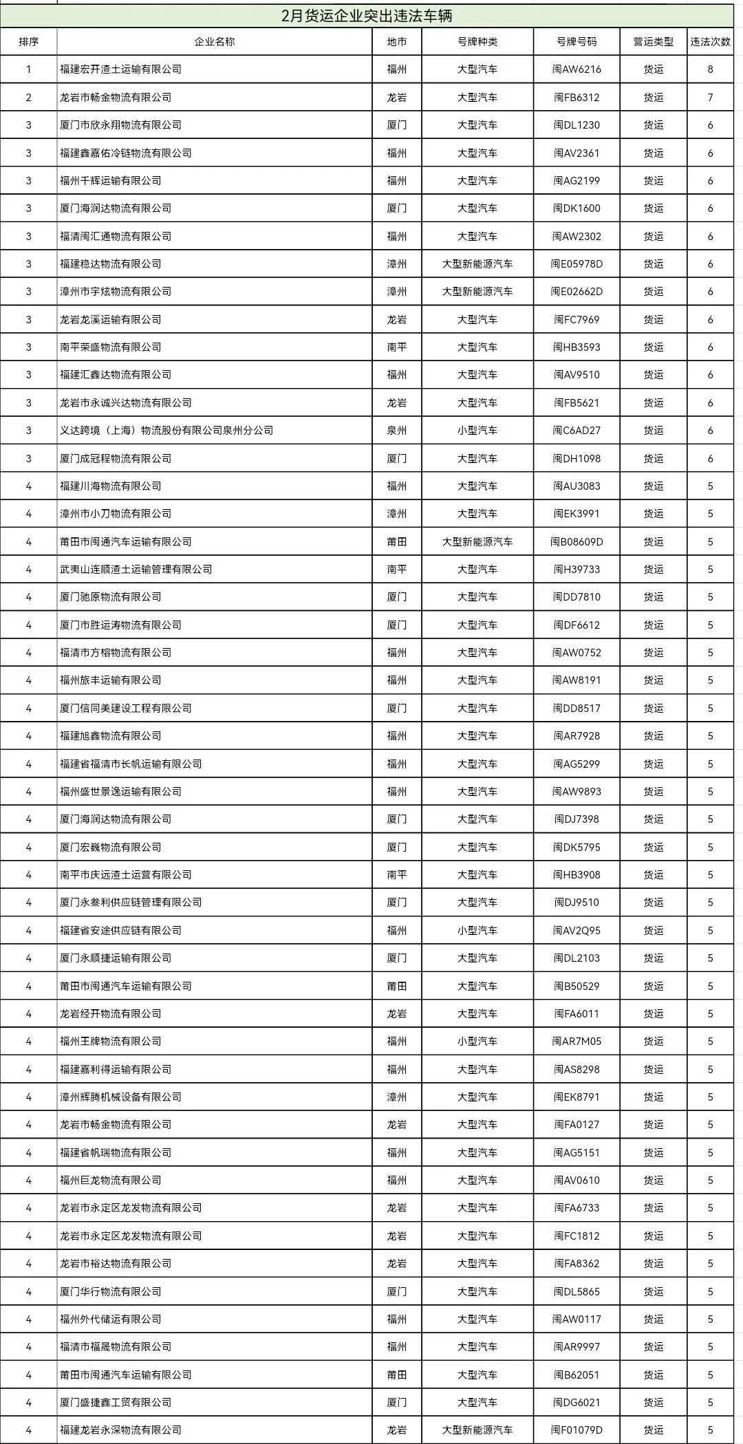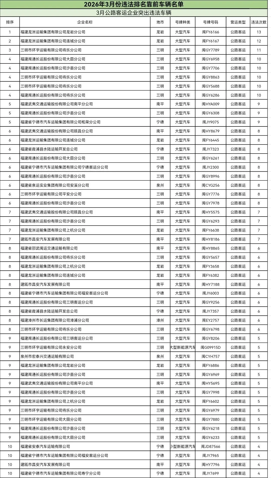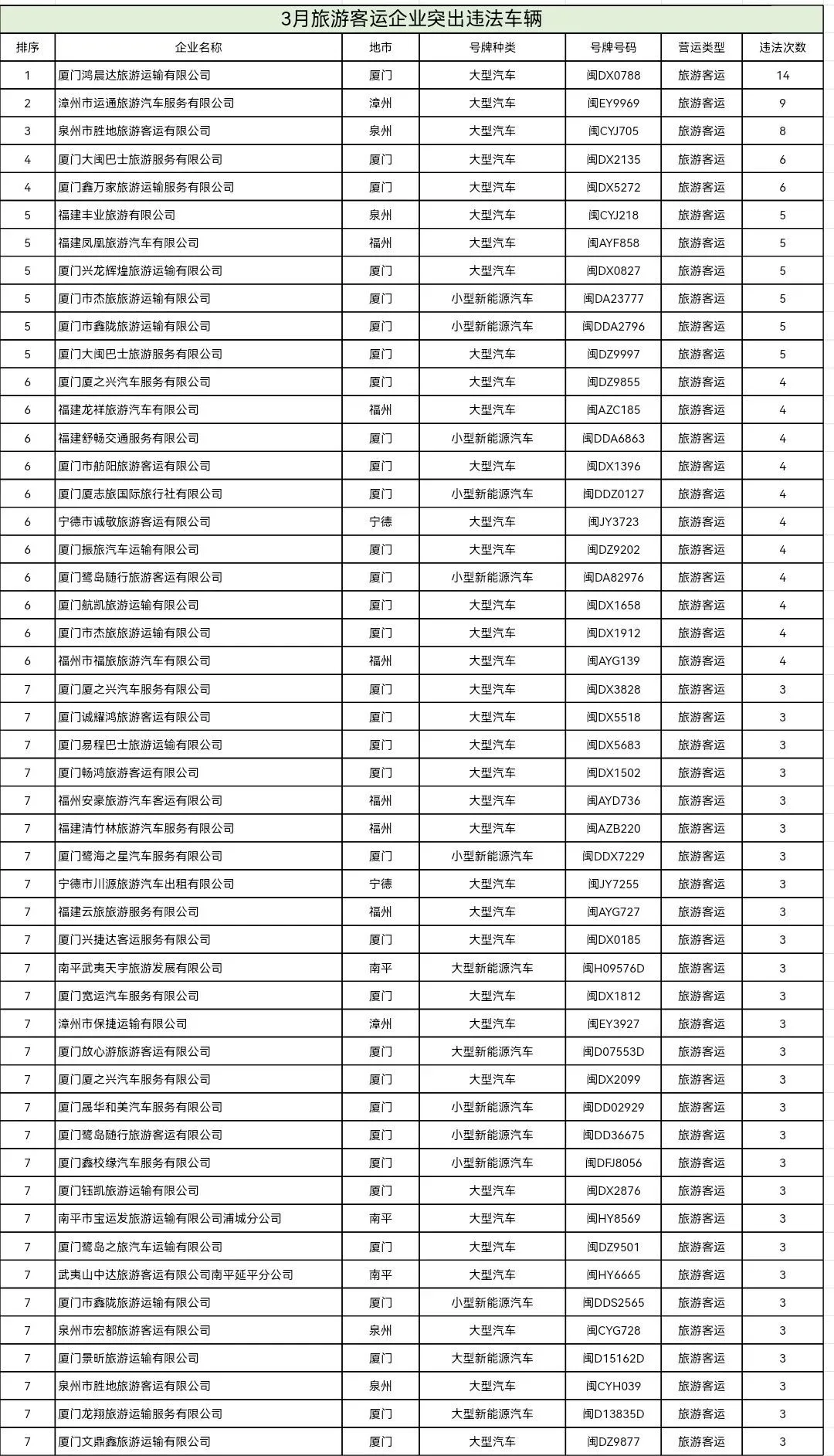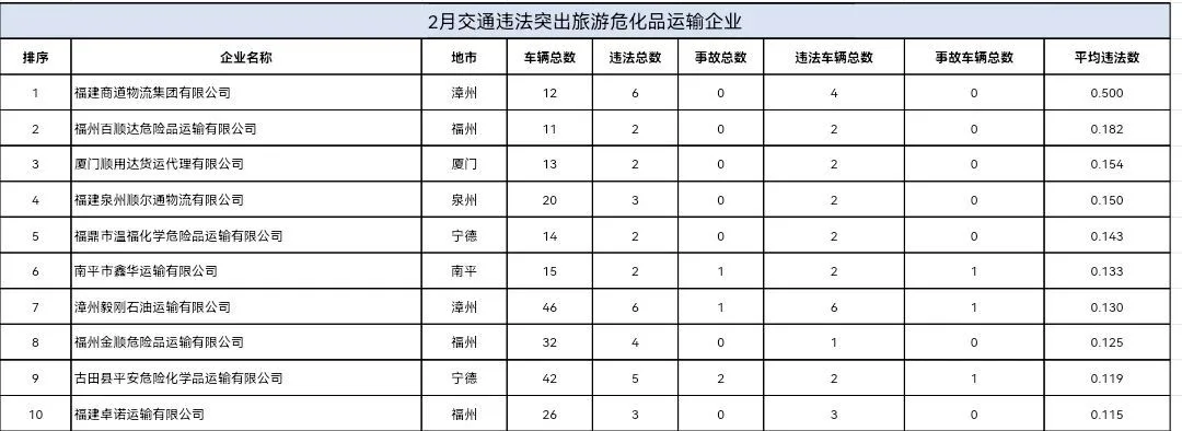 东南网4月20日讯(本网记者 翁莉)日前,福建省公安厅交通管理总队集中曝光2026年2—3月全省公路客运、普通货运、旅游客运、危险货物运输四类重点行业中,交通违法总量居前的运输企业及车辆名单,通过公开警示压实企业主体责任、强化源头风险治理。