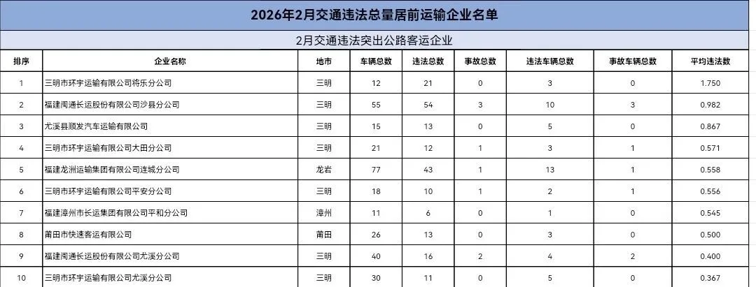 2026年2月份交通违法总量居前运输企业名单