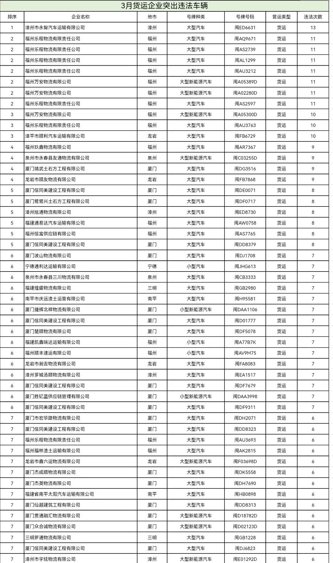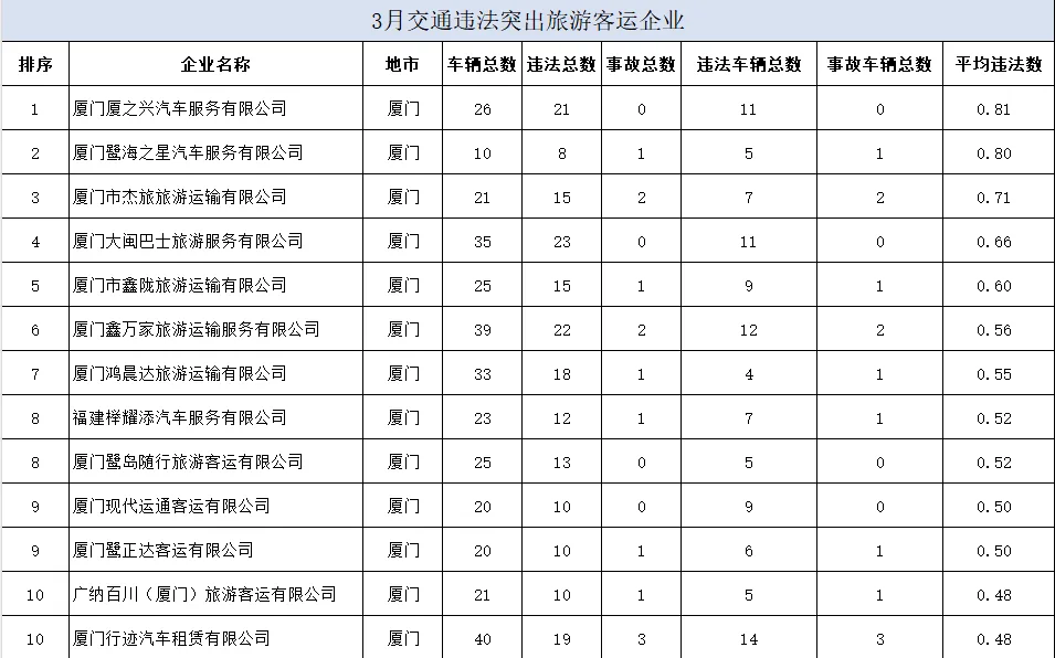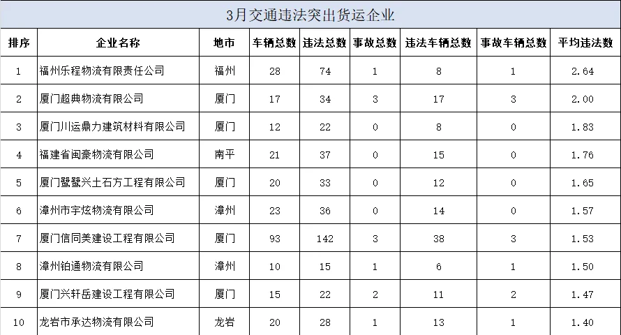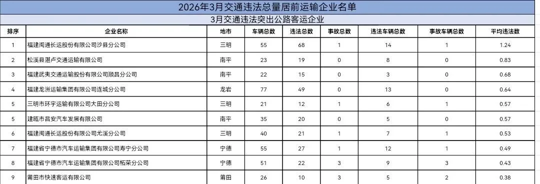 2026年3月份交通违法总量居前运输企业名单