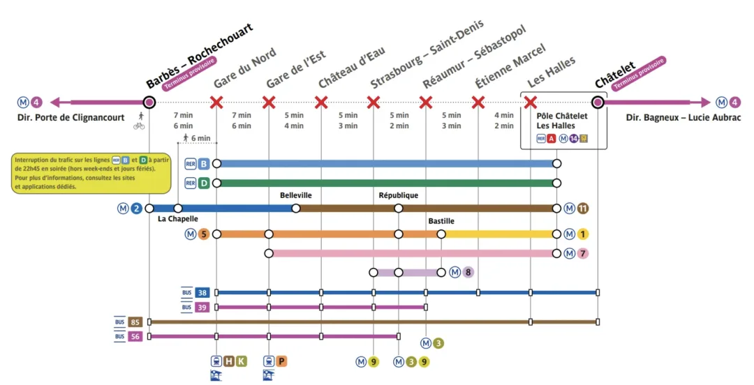 在此期间,Barbès-Rochechouart站与Châtelet站之间将完全关闭,包括Gare du Nord站,Gare de l’Est站,Château d’Eau站,Strasbourg–Saint-Denis站,Réaumur–Sébastopol站,Étienne-Marcel站和Les Halles站。