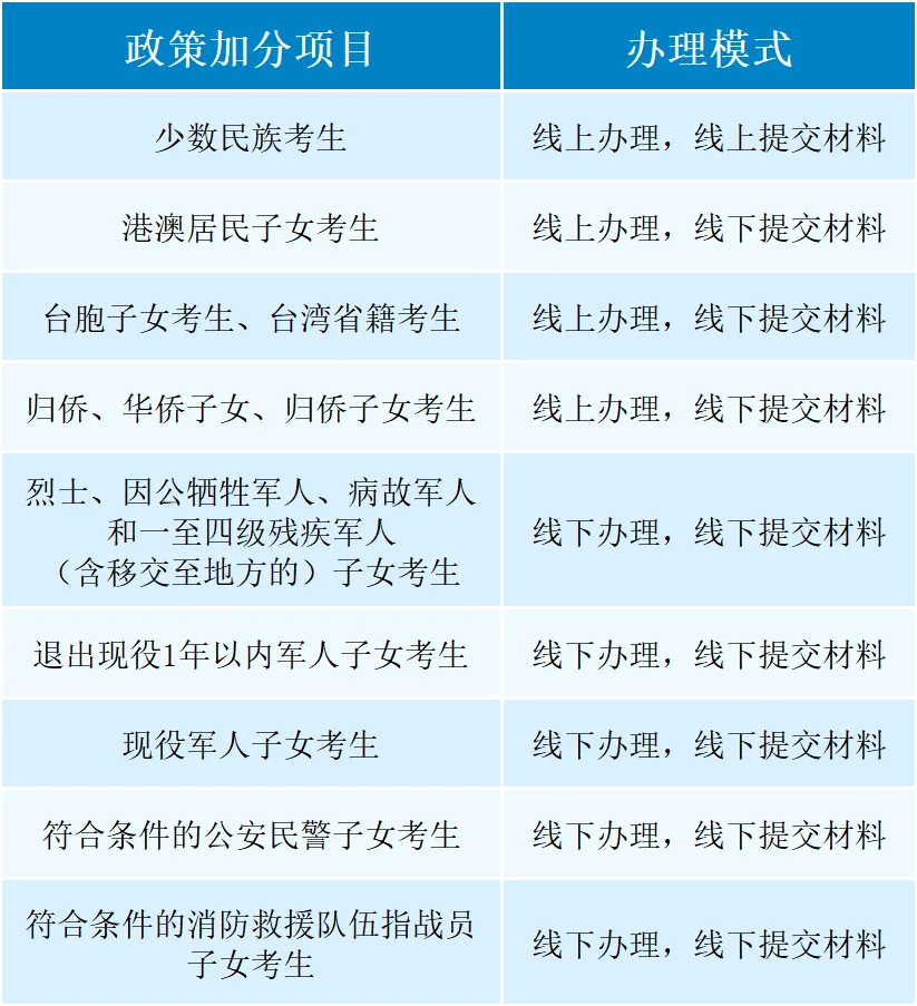 2.非温州市区初中学校就读,选择回户籍地(市区)报考或录取的考生,属于少数民族加分对象的,加分申请由各录取地确认点(报考点)负责线上代办;属于归侨、归侨子女、华侨子女,台胞子女、台湾省籍考生等中考政策加分对象的,加分申请由各录取地确认点(报考点)负责线上代办,线下材料送户籍地侨办、台办审核。