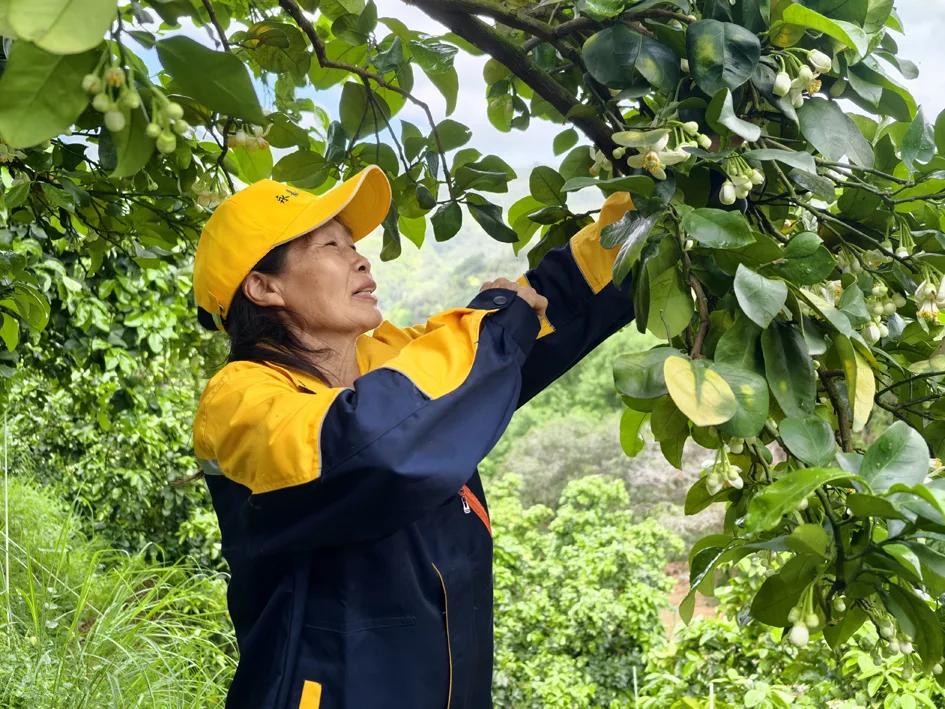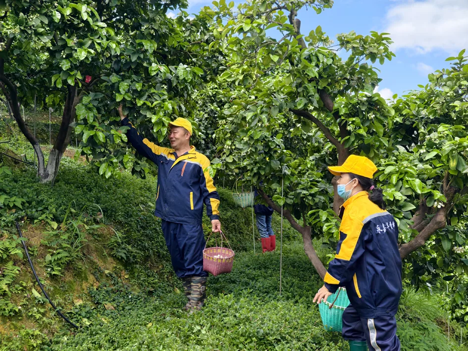 “最早是农业专家来教怎么留、怎么摘,现在自己都会了。”郑笑微家有十多棵柚子树,自家花已经摘好,这几天来基地帮忙采摘。她说,过去不懂疏花,一个枝条上留一大串,结出的柚子又小又酸。现在大家都懂了,留得少,才能长得好。而摘下来的柚花,过去随手扔在地里烂掉,如今也成了“致富花”。