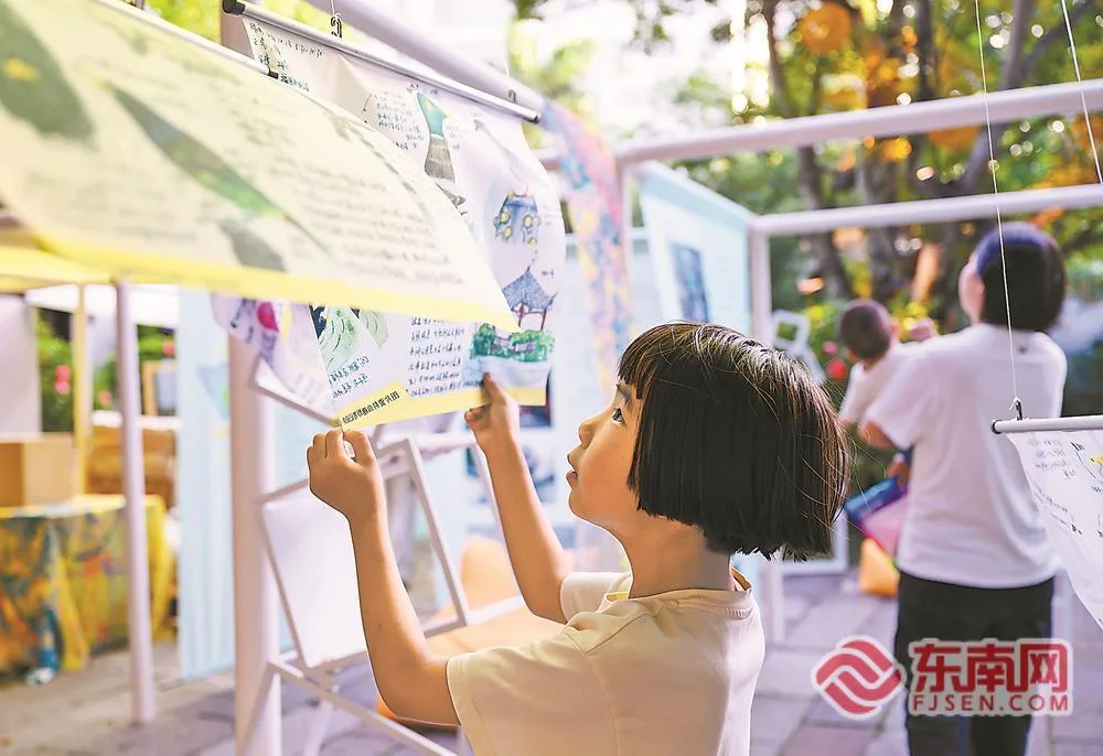 在春日市集的自然生态互动阅读区,一名小朋友观看儿童鸟类自然观察笔记。福建日报记者 施辰静 摄
