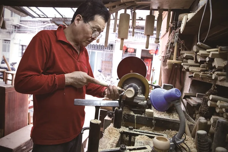 “最早我的车木店开在仓桥街,那时仓桥街聚集了许多手工艺人,市区总共20多家车木铺子,就有7家开在仓桥街上。后来因城市发展建设需要,我把店搬到了三官殿巷,一直到现在。”李定华说,开店初期,更多是为了生计。“早年车木技艺是铁饭碗,不愁没生意,那时候上班族的月薪才30多元,我们做车木一天就有5元收入。”在父亲的带领下,他开始接订单从事车木行业,大到床、家具、柜子,以及阳台上的葫芦杆护栏,小到螺丝刀柄、榔头柄,大多是生活实用品。