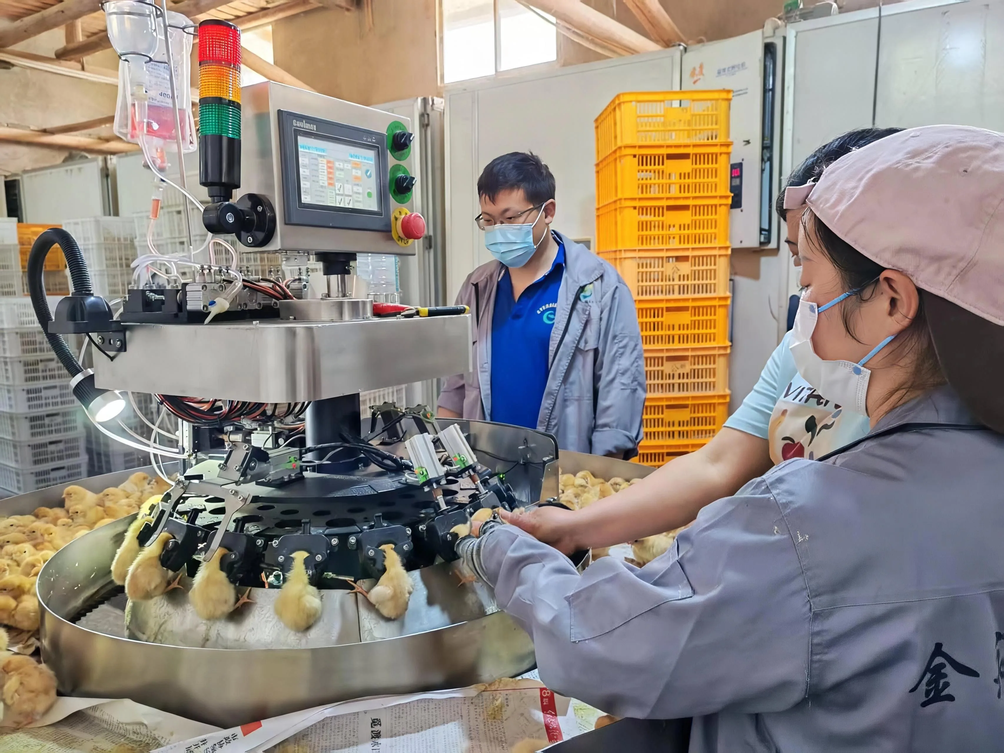 武平金永诚农牧有限公司孵化车间,工作人员在操作断喙注射一体机。 (武平县融媒体中心供图)