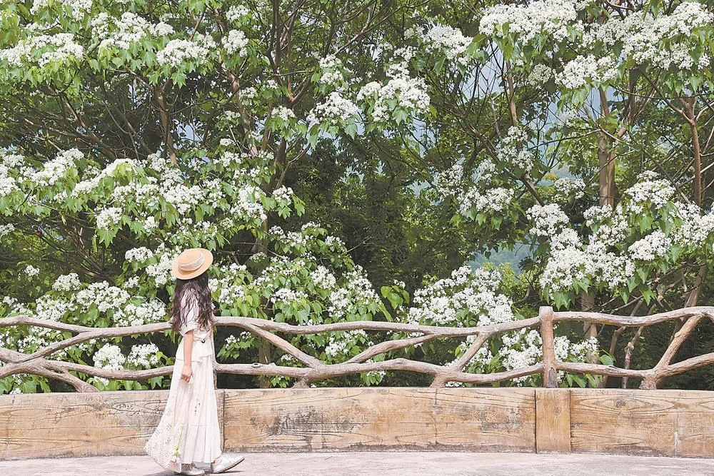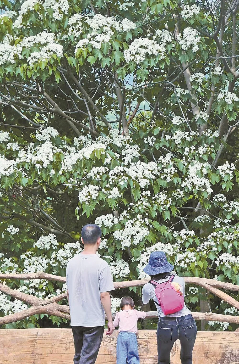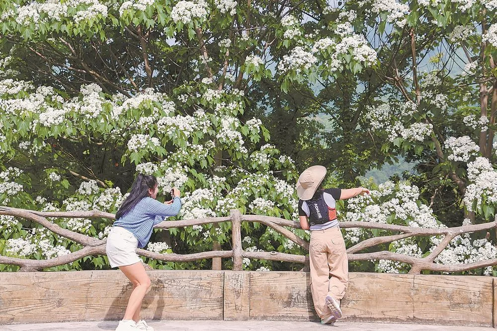 近日,厦门市海沧区天竺山4万株桐花迎来盛花期,漫山桐花如云似雪,洁白的花朵缀满枝头,与翠绿山林相映成趣,吸引众多市民游客前来踏青赏景。图为20日,游客在天竺山观赏盛放的桐花。福建日报通讯员 李娴凤 摄影报道