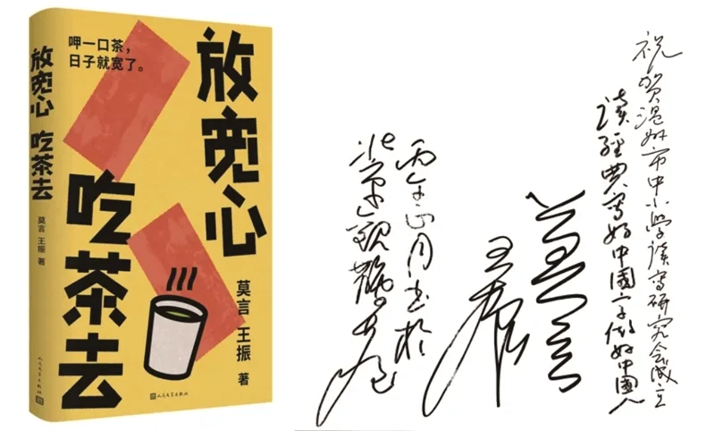 2025年,莫言与王振推出新书《放宽心,吃茶去》(人民文学出版社出版),该书以“文墨共生”为核心理念,融合作者的旅行摄影、书法与随笔,借助创新光影技术展现莫言左手书法的墨色层次与流动质感,传递“以脚步丈量山河,以笔墨书写心境”的生命热忱与豁达心境,为读者呈现行走与书写交融的文化意蕴。