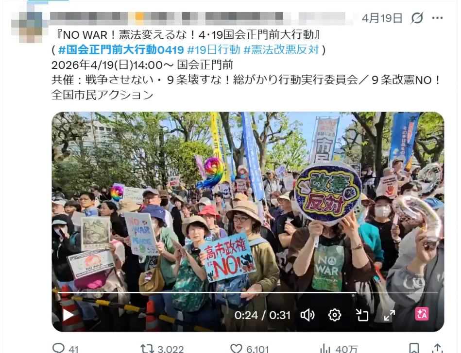 《卫报》报道指出,进入4月以来,日本全国各地抗议活动明显升温。上周日,一场大规模集会在东京国会议事堂前举行,约3.6万人聚集至永田町一带,要求停止修改宪法,并反对日本卷入中东战争。该地点靠近当年宪法制定地,具有强烈象征意味。
