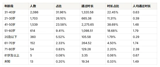 如果只看总量,这无疑是一次成功的方言抢救行动。而目光投向参与人年龄分布,参与者的代际差异颇令人心惊:20岁以下群体不仅参与人数最少,人均通过时长也最低——只有0.29小时,而71-80岁老人的平均时长是它的8倍还多。年龄越大,方言越“纯”。数据显示,71-80岁年龄组人均通过时长高达2.39小时,是所有年龄段中最高的,甚至还有5位80岁以上的老人参与了录制。
